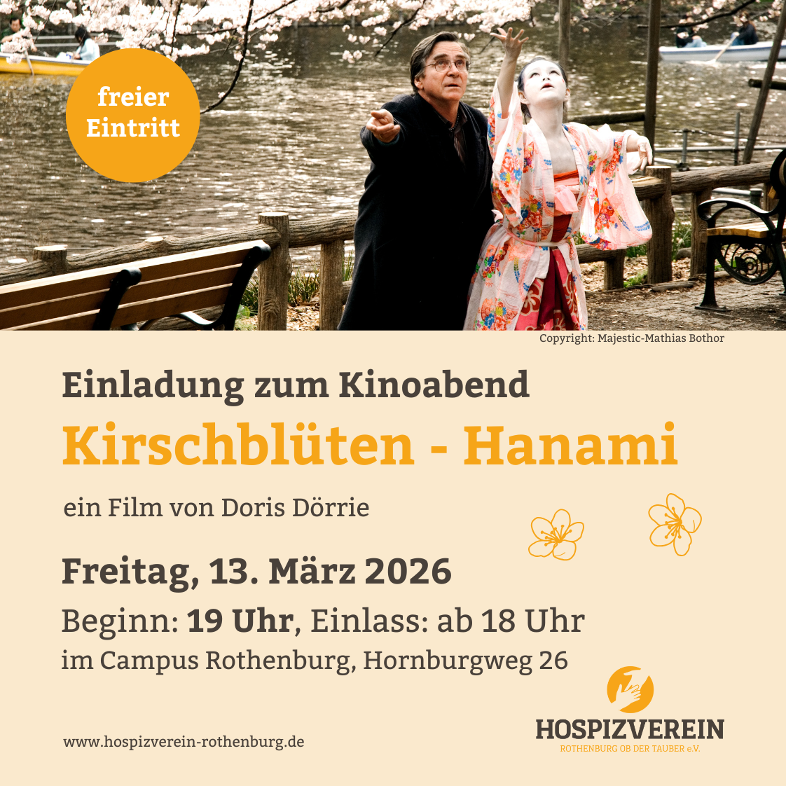 Wir zeigen diesmal den Film "Kirschblüten Hanami". Dort spielt Elmar Wepper die Rolle des krebskranken Rudi, der erst nach dem plötzlichen Tod seiner Frau Trudi erfährt, wie sehr sie ihr Leben für ihn zurückgestellt hat. Der Eintritt ist frei. Wir würden uns freuen, wenn Sie auch dieses Jahr wieder zahlreich erscheinen und mit uns einen großartigen Abend verbringen.