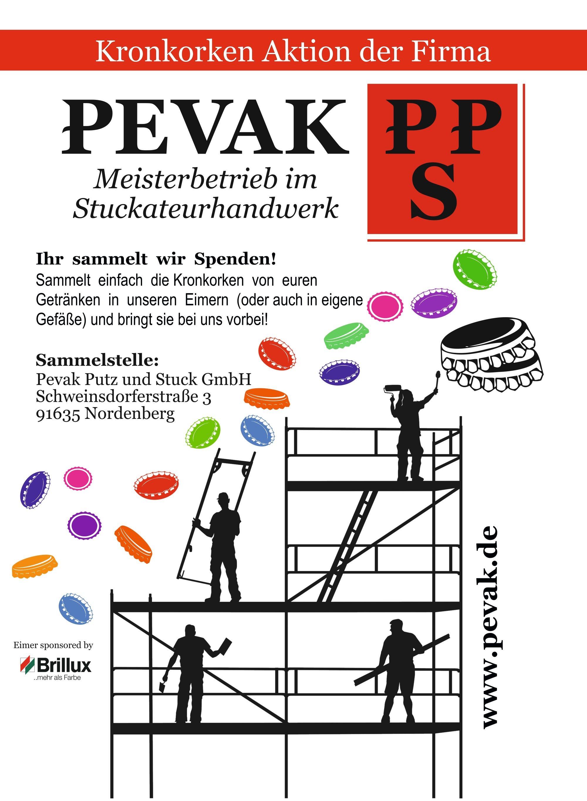 Die Firma Pevak lässt ein ganzes Jahr von privaten Personen, sowie Gastwirtschaften und Veranstaltern, Kronkorken sammeln. Diese werden nach Gewicht vergütet. Der Erlös plus eine „Aufrundung“ der Firma, wird an unseren Hospizverein gehen. Wir möchten alle Menschen rund um Rothenburg auffordern an der Aktion mitzumachen und Kronkorken zu sammeln.