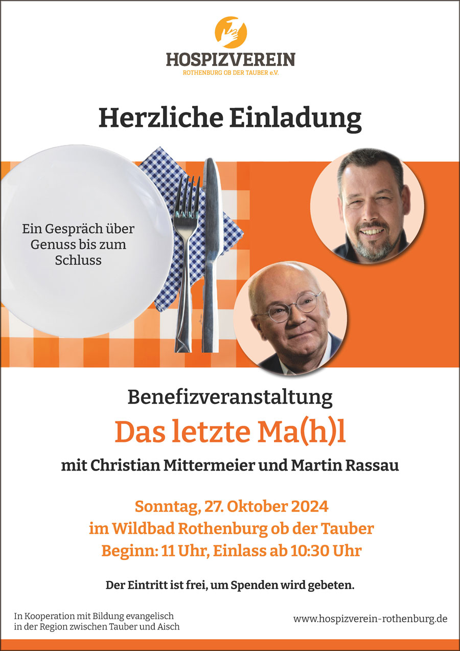 Der Kabarettist, Schauspieler und Theaterdirektor Martin Rassau aus Fürth und der Sternegastronom und Hotelier Christian Mittermeier aus Rothenburg unterhalten sich darüber, ob und wie dieser Genuss bis ans Lebensende und sogar im Sterbeprozess möglich ist. Im Dialog mit dem Publikum nähern sich Martin Rassau und Christian Mittermeier dem Thema Genuss aus verschiedenen Blickwinkeln: Welche Bedeutung hat Geschmack für unser Leben? Wie kann man genießen, wenn das Schlucken nicht mehr möglich ist? Wie können wir diese besondere Verbindung, die bei einer gemeinsamen Mahlzeit entsteht, auch am Sterbebett erreichen? Was bedeutet „das Auge isst mit“ im Angesicht des Todes?